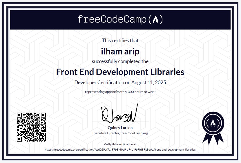 Completed the Frontend Development certification from freeCodeCamp, covering responsive design, JavaScript, and React fundamentals.